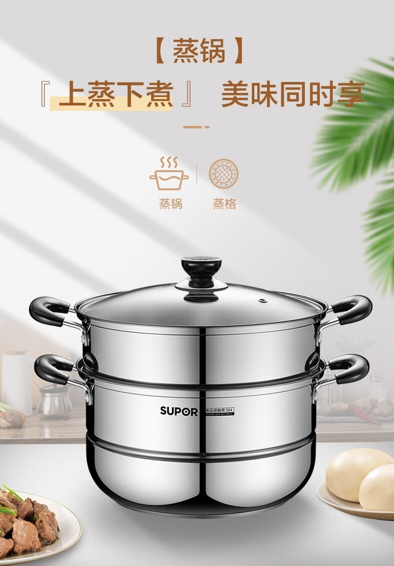 SUPOR Non stick Fry Pot Smokeless Kitchen Full Pot Set Combination Flat Bottom Pot Soup Pot Fry Pot Gas Induction Stove Universal Four Piece Set [Fry+Fry+Soup+Steam]