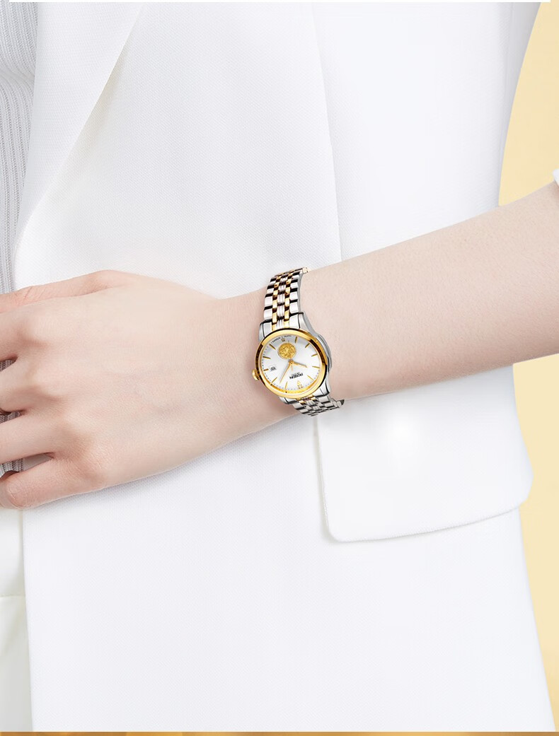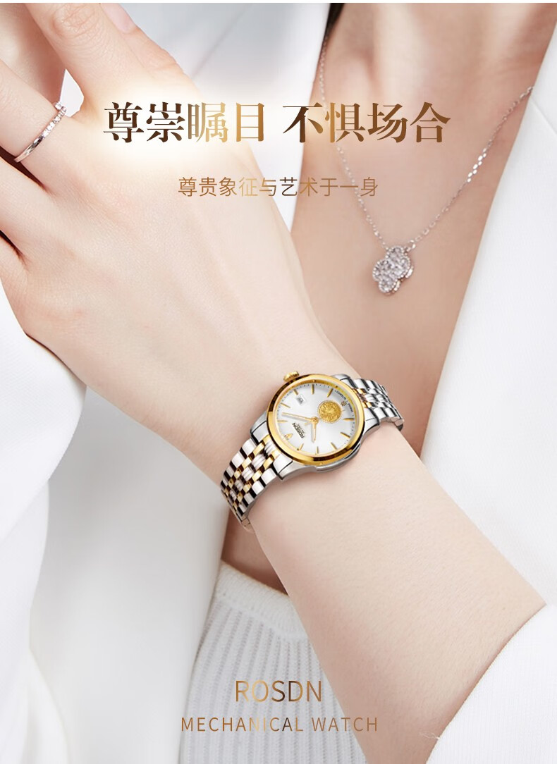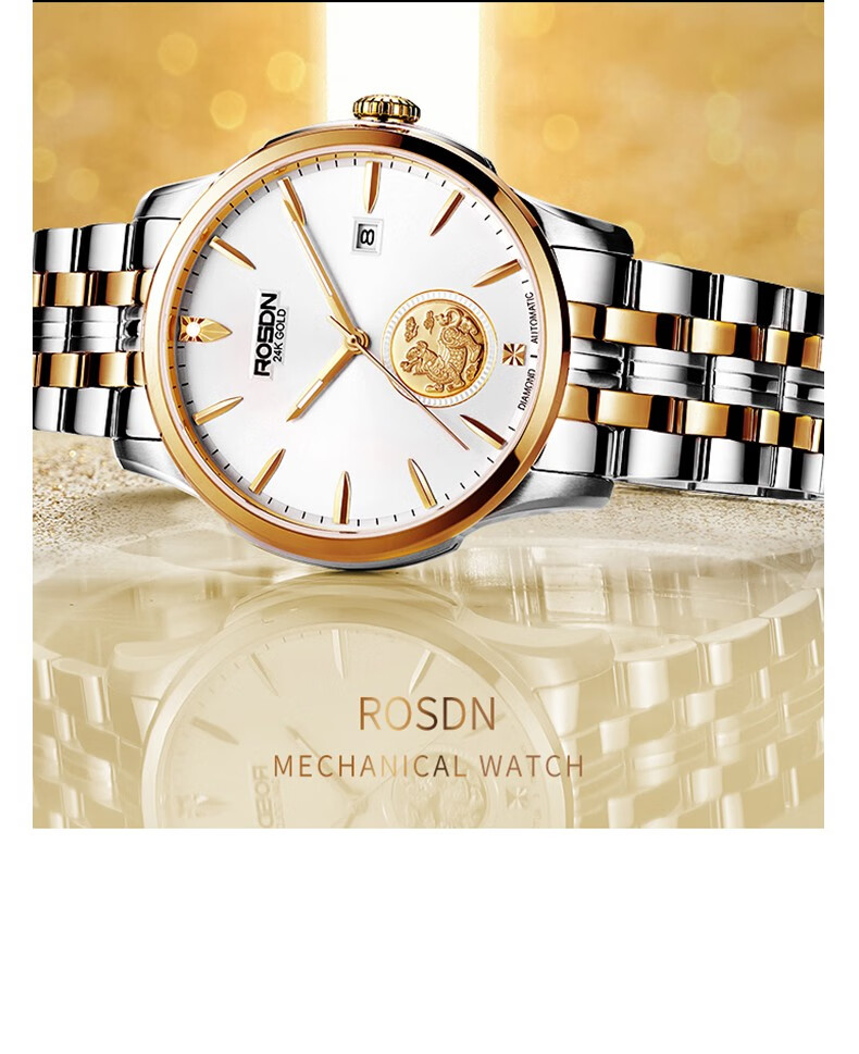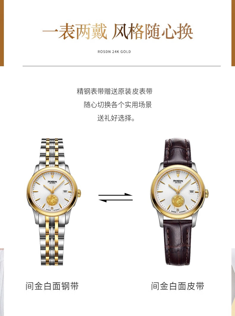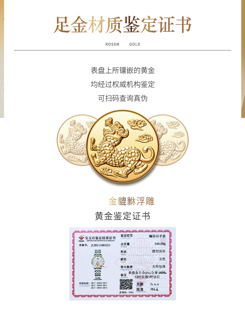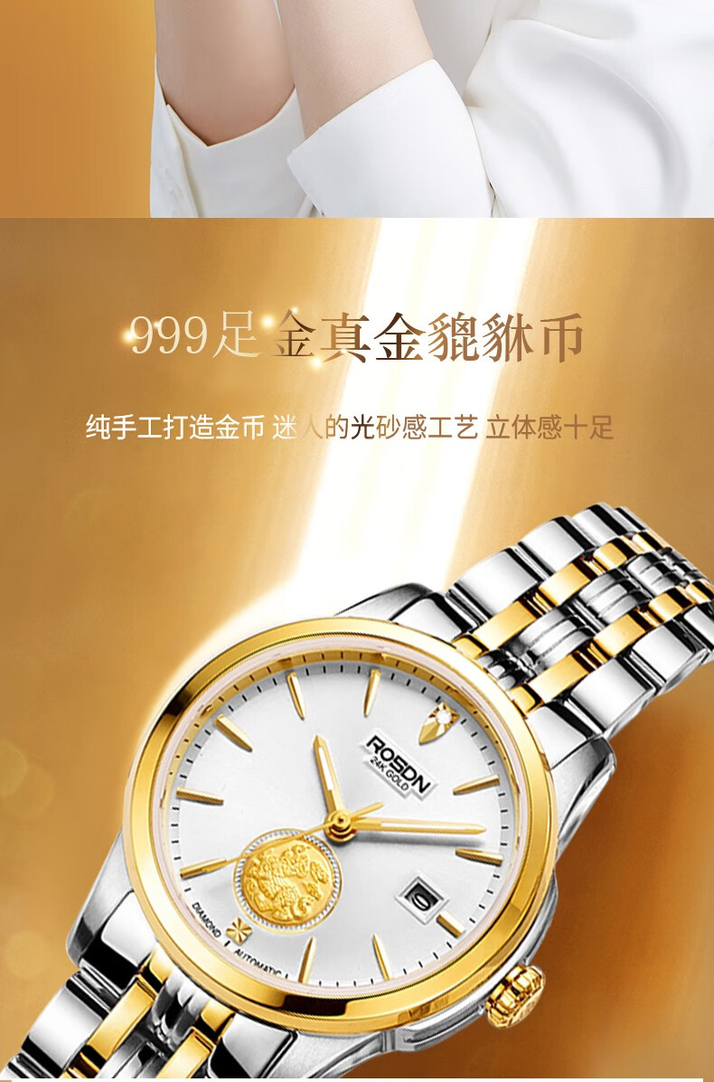 ROSDN Gold Watch Full Gold 999 Gold Coins Real Diamond Watch Women's Mechanical Watch Brand Swiss Quality Women's Watch 【 Zhaocai Nafu Pixiu 】 Medium Gold White Face Steel Strip