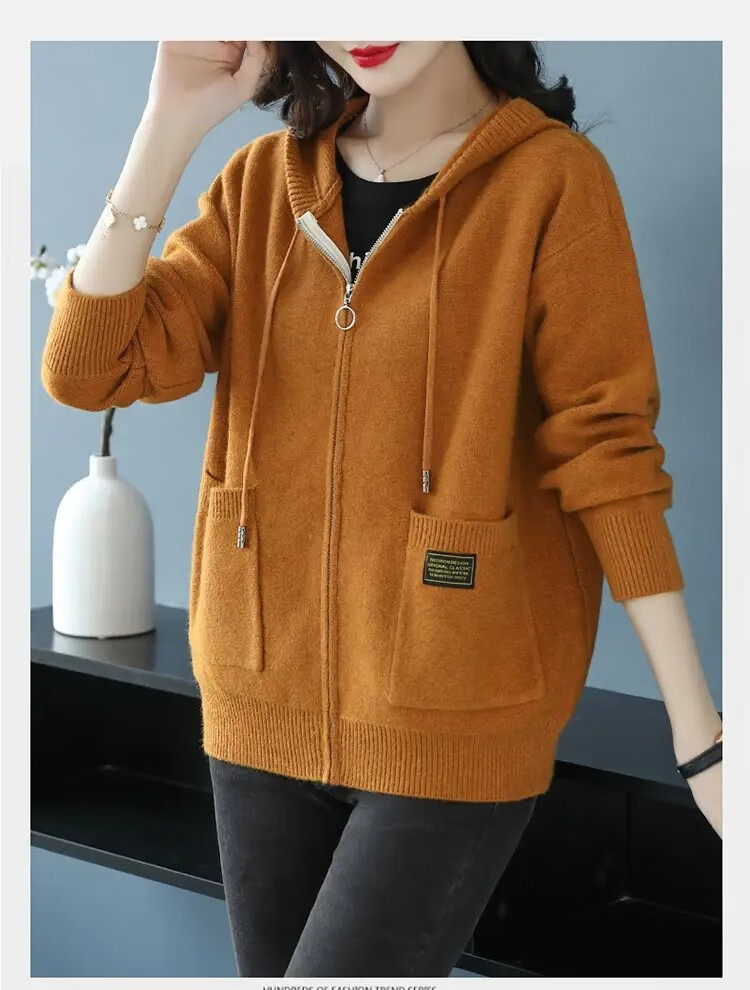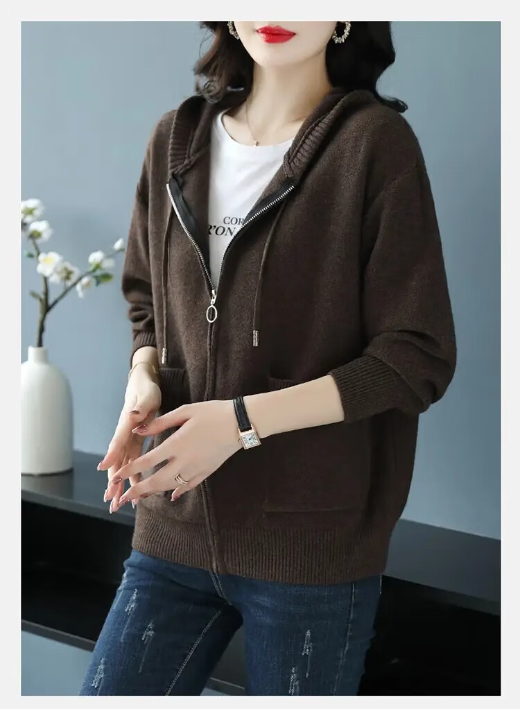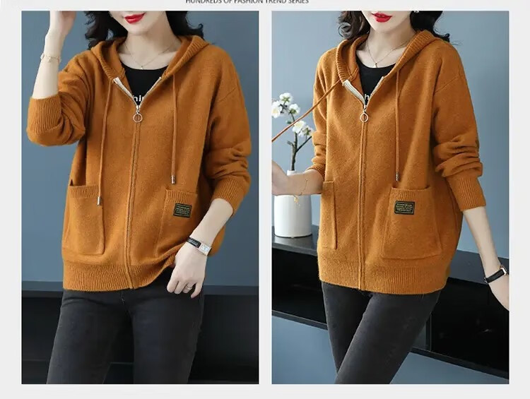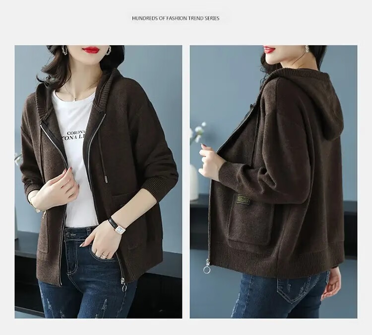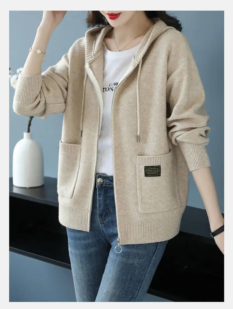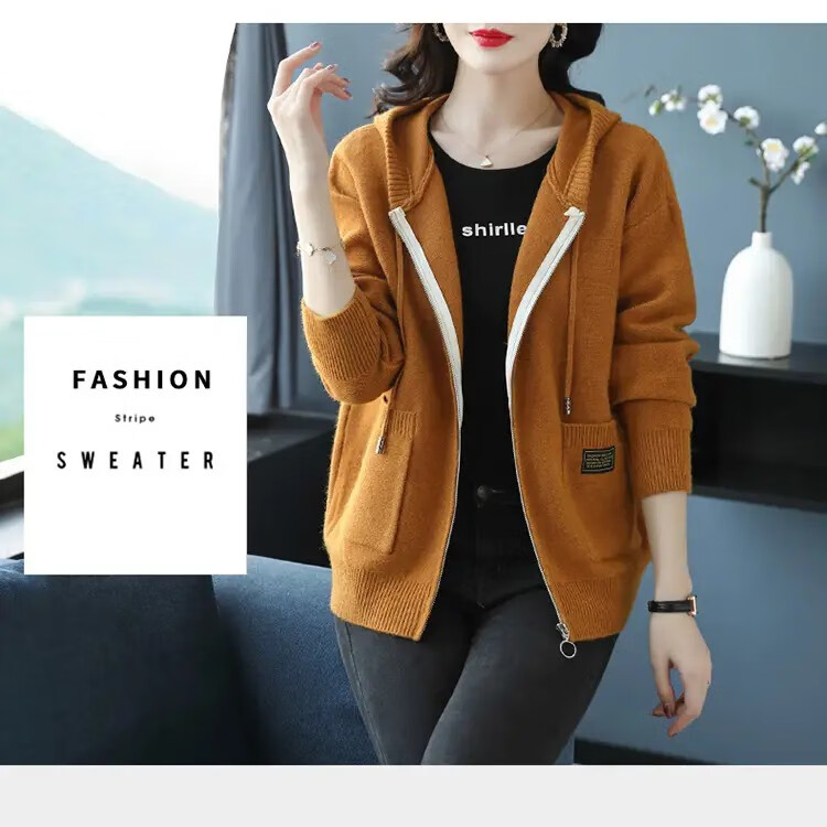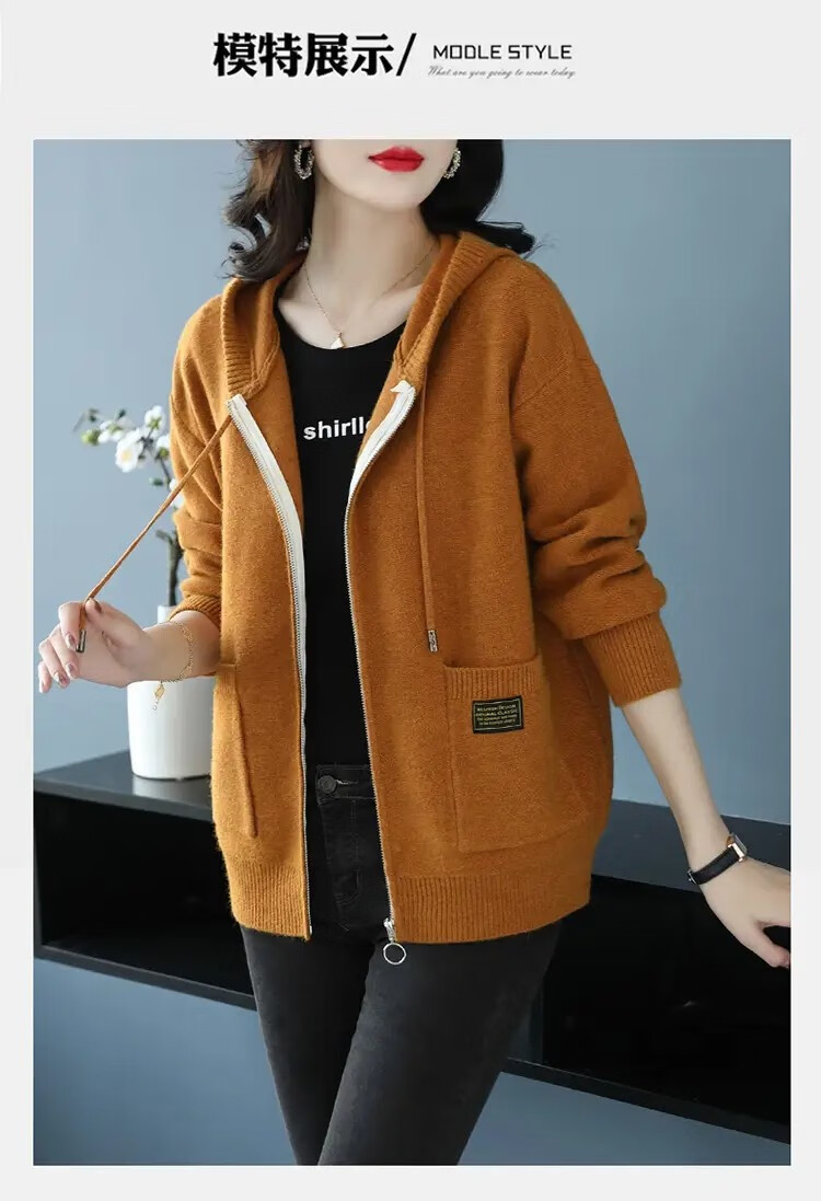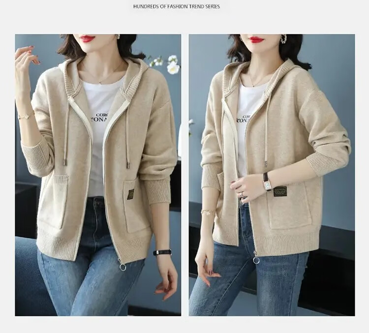 商品名称:红蜻蜓连帽毛衣短外套女秋装新款时尚外搭保暖宽松带帽针织开衫春秋 米白色长袖 均码