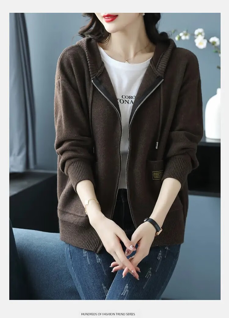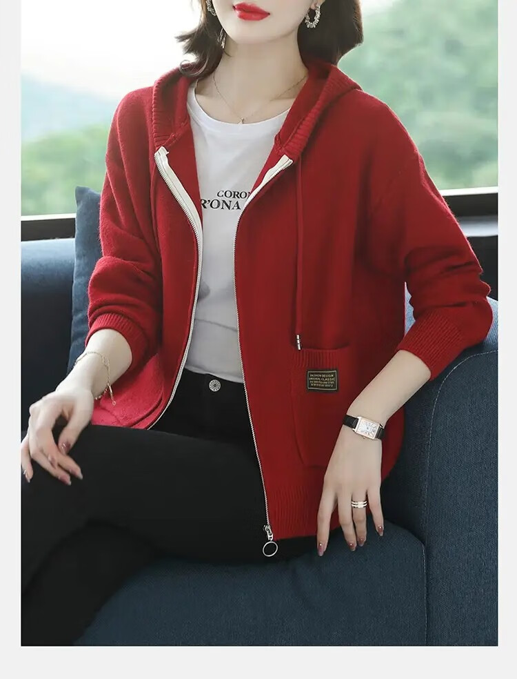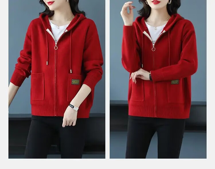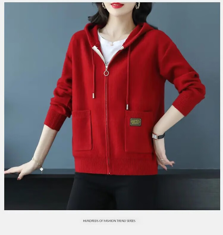 Red Dragonfly Hooded Sweater Short Coat Women's Autumn New Fashion Outfit Warm Loose Hooded Knitted Cardigan Spring and Autumn Off White Long Sleeve One Size fits All