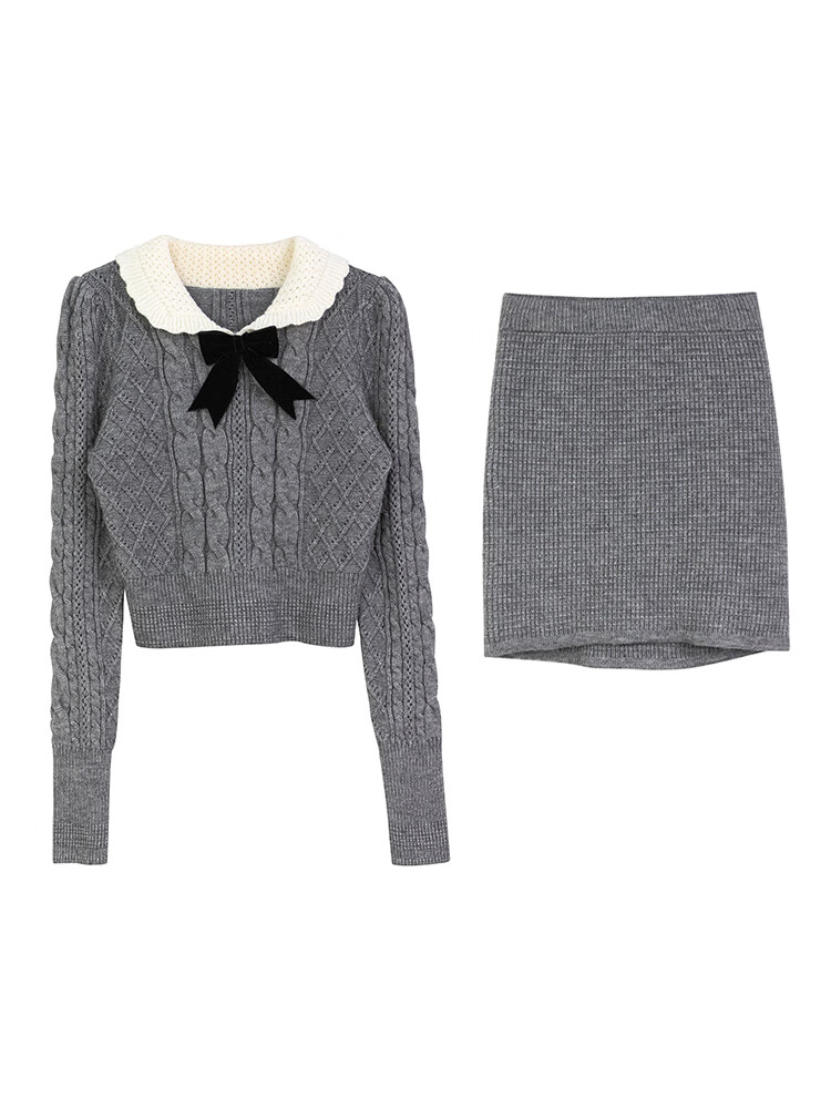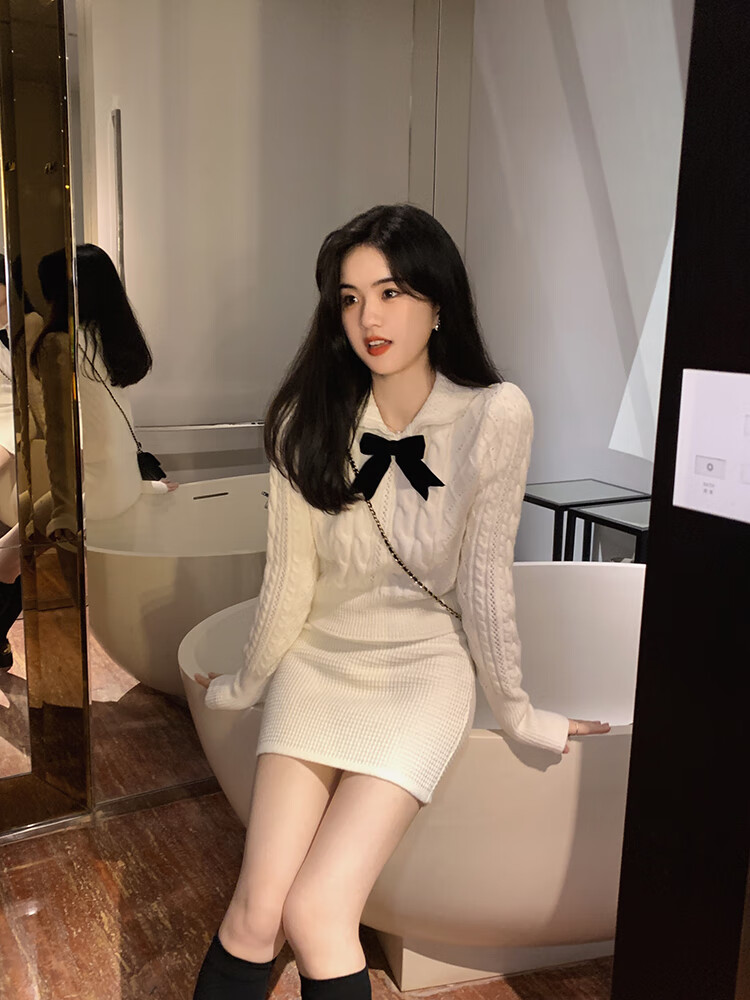 Ou Ruo Ting Ya Knitted Dress Autumn and Winter Small Tall New Academy Style Bow Korean Edition Fashion and Temperament Two piece Set Skirt Off White M