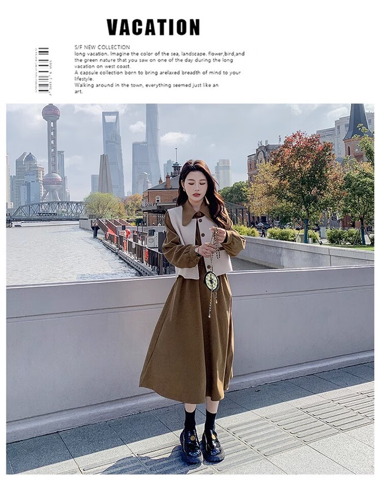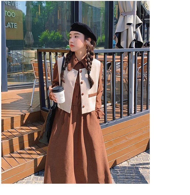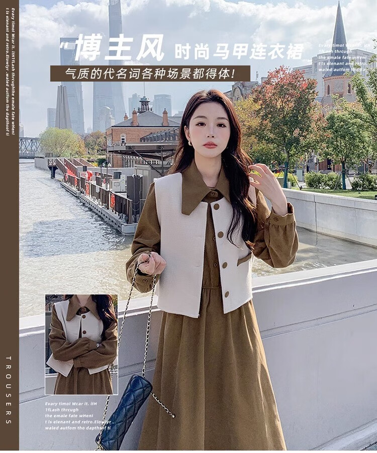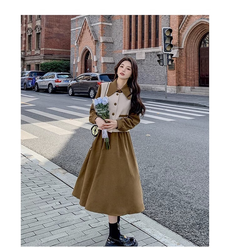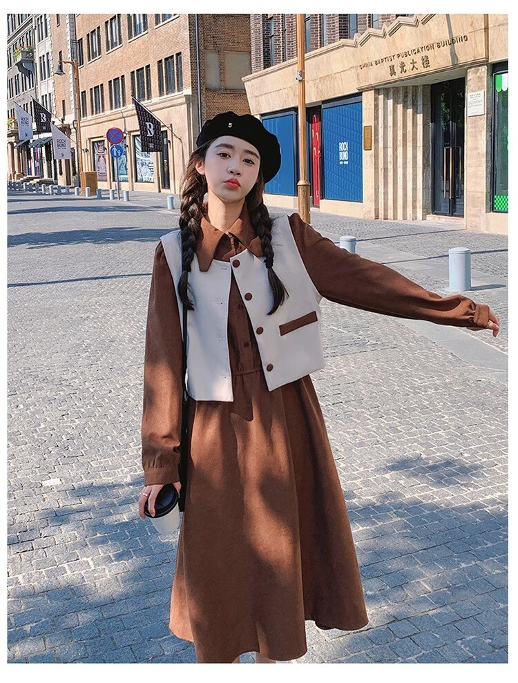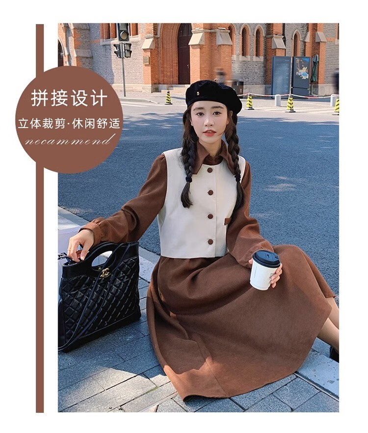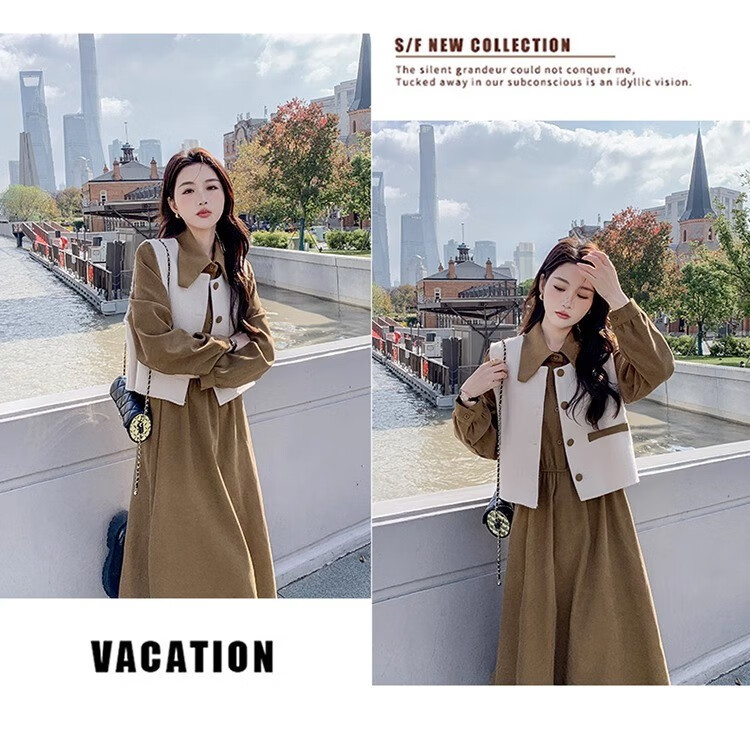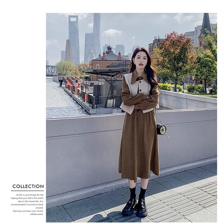 商品名称:宏资琦小香风连衣裙2023秋冬新款女装韩版长袖轻熟风马甲衬衫裙子两件装 咖色 L(建议110—119斤)