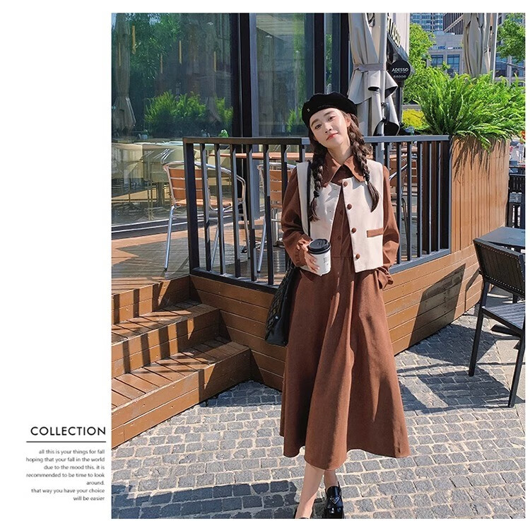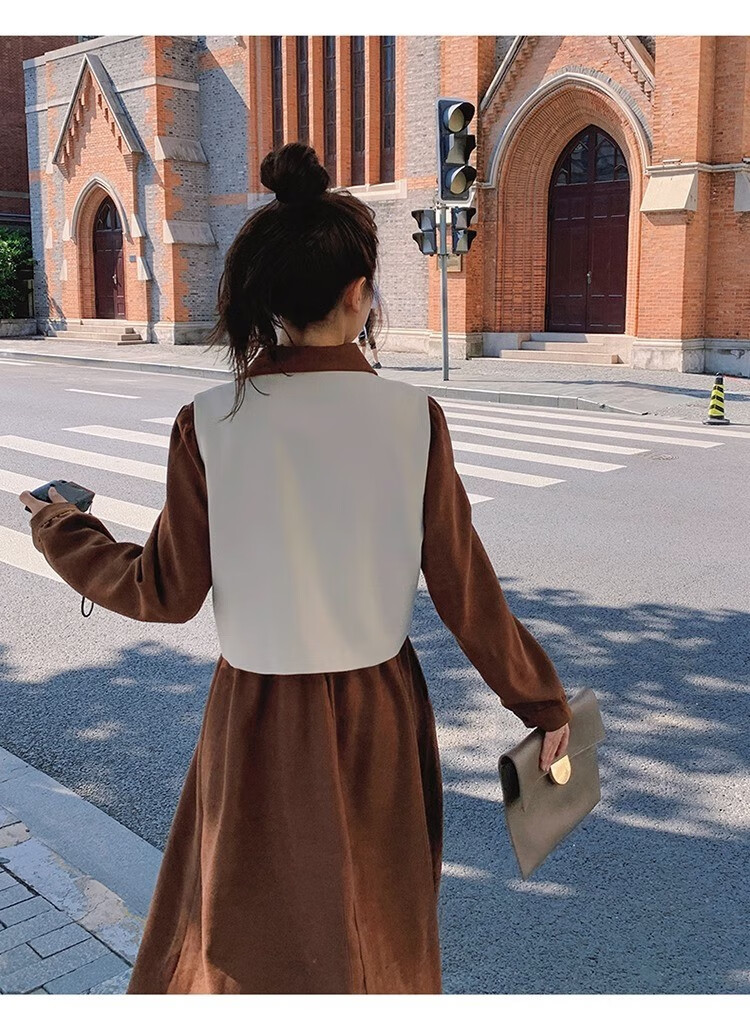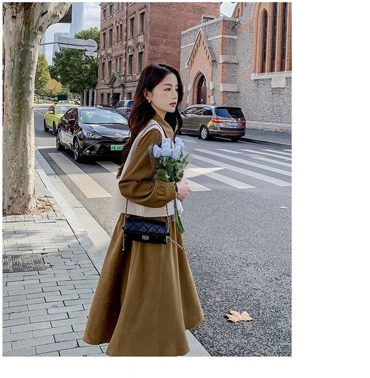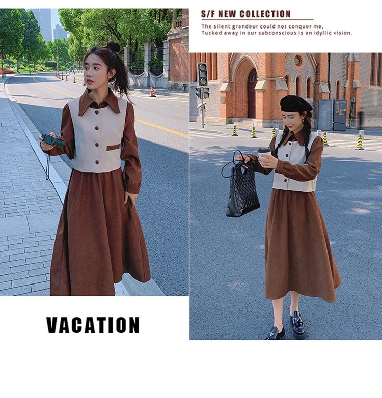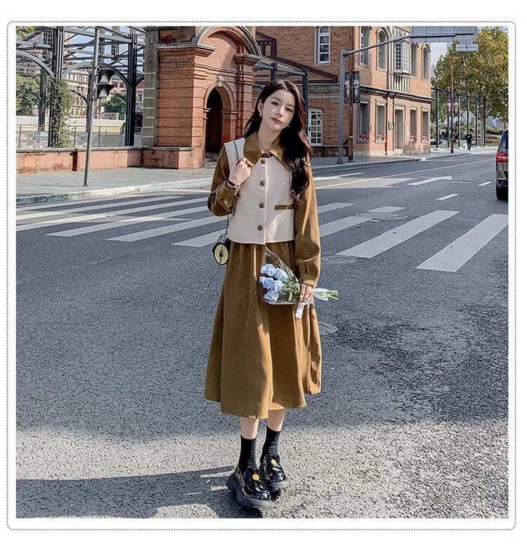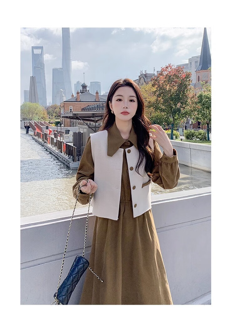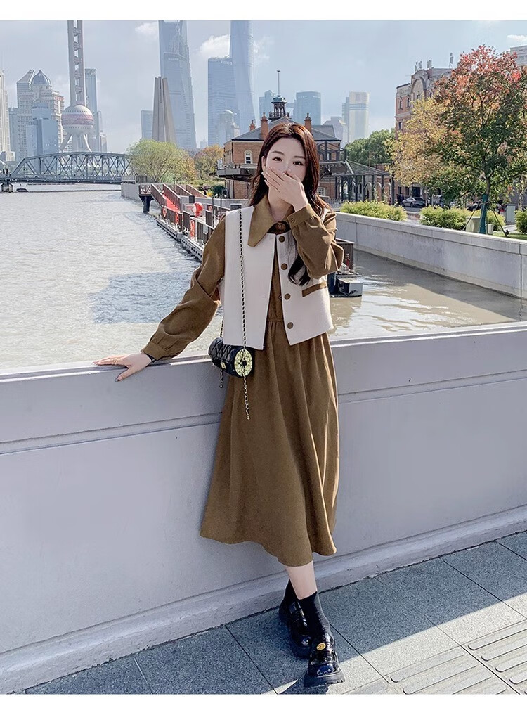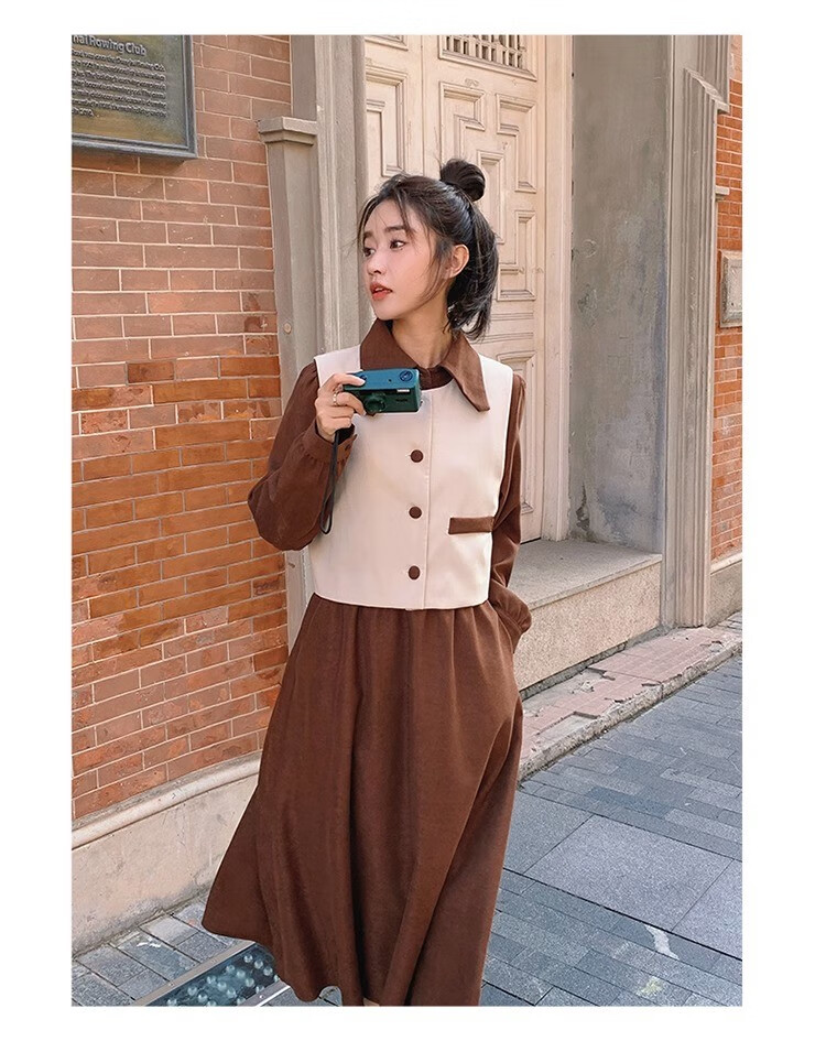 商品名称:宏资琦小香风连衣裙2023秋冬新款女装韩版长袖轻熟风马甲衬衫裙子两件装 咖色 L(建议110—119斤)