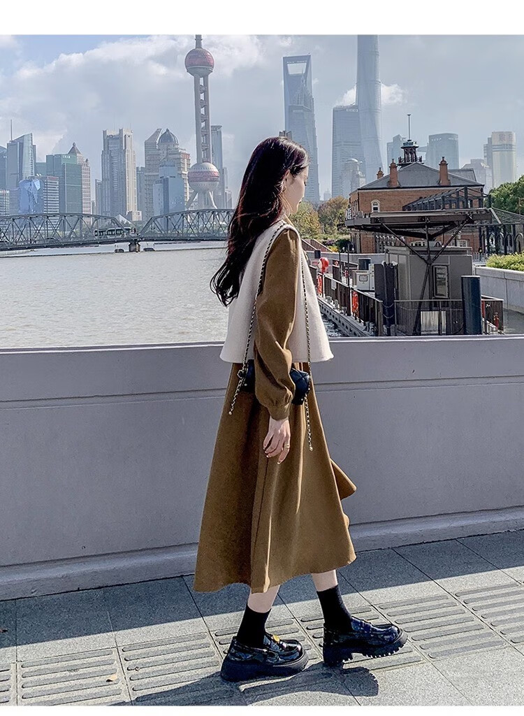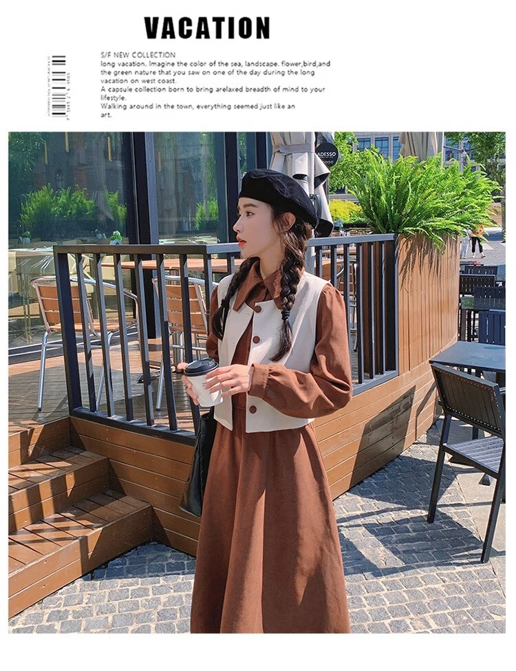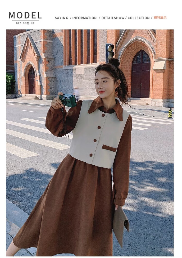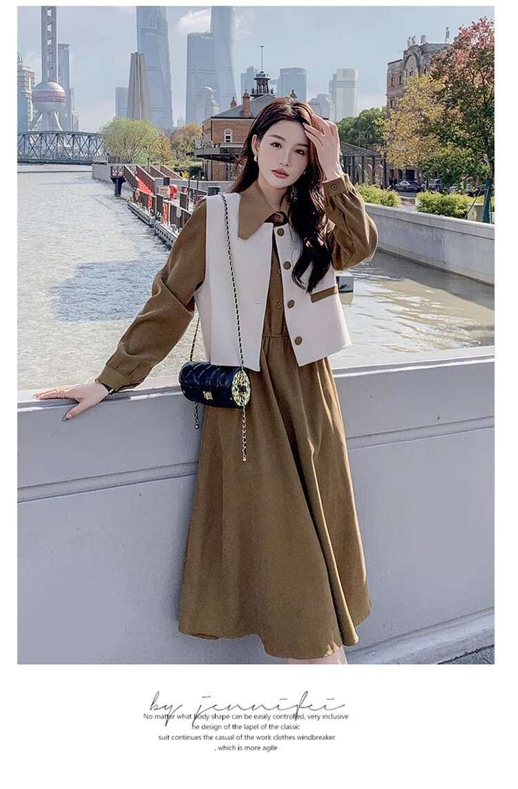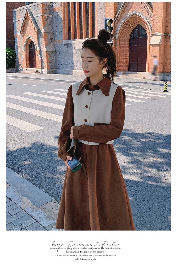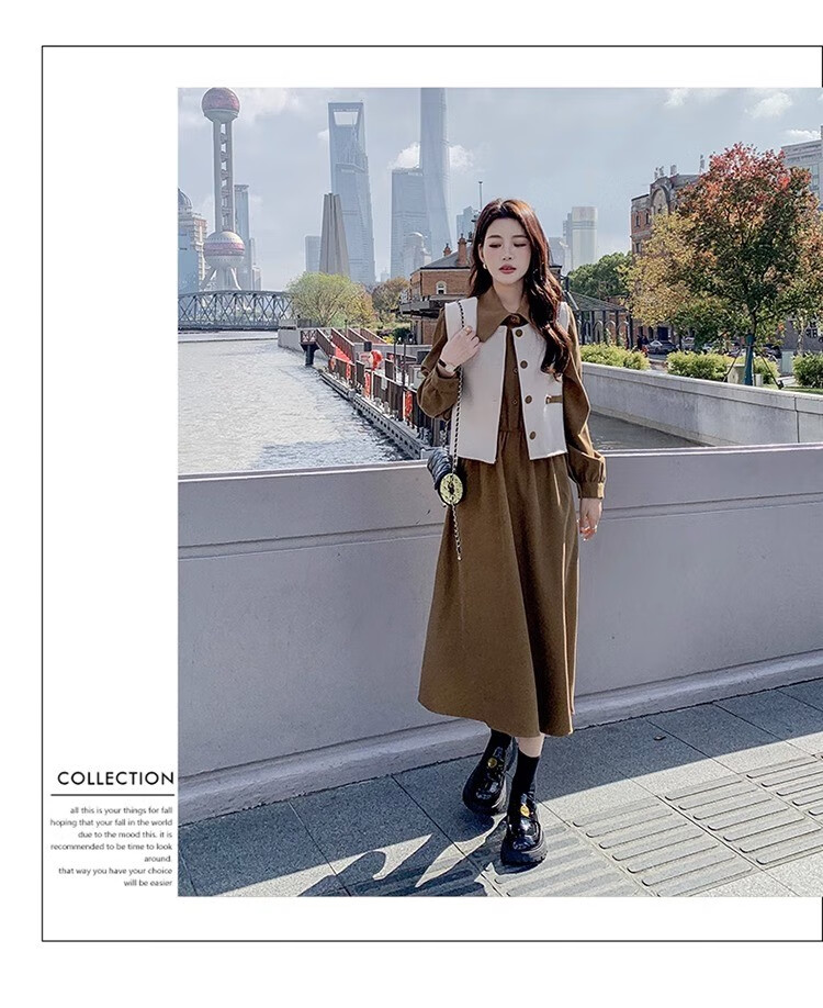 商品名称:宏资琦小香风连衣裙2023秋冬新款女装韩版长袖轻熟风马甲衬衫裙子两件装 咖色 L(建议110—119斤)