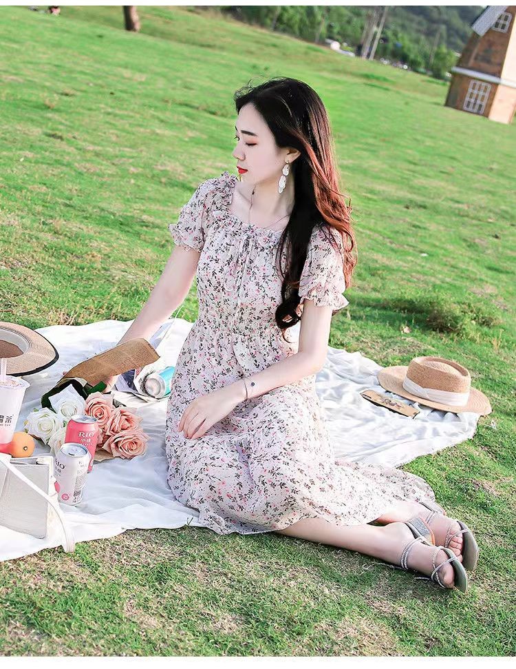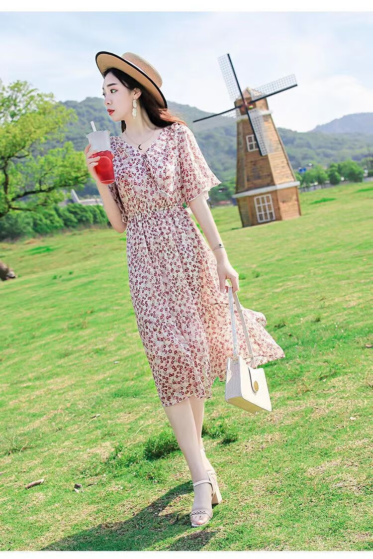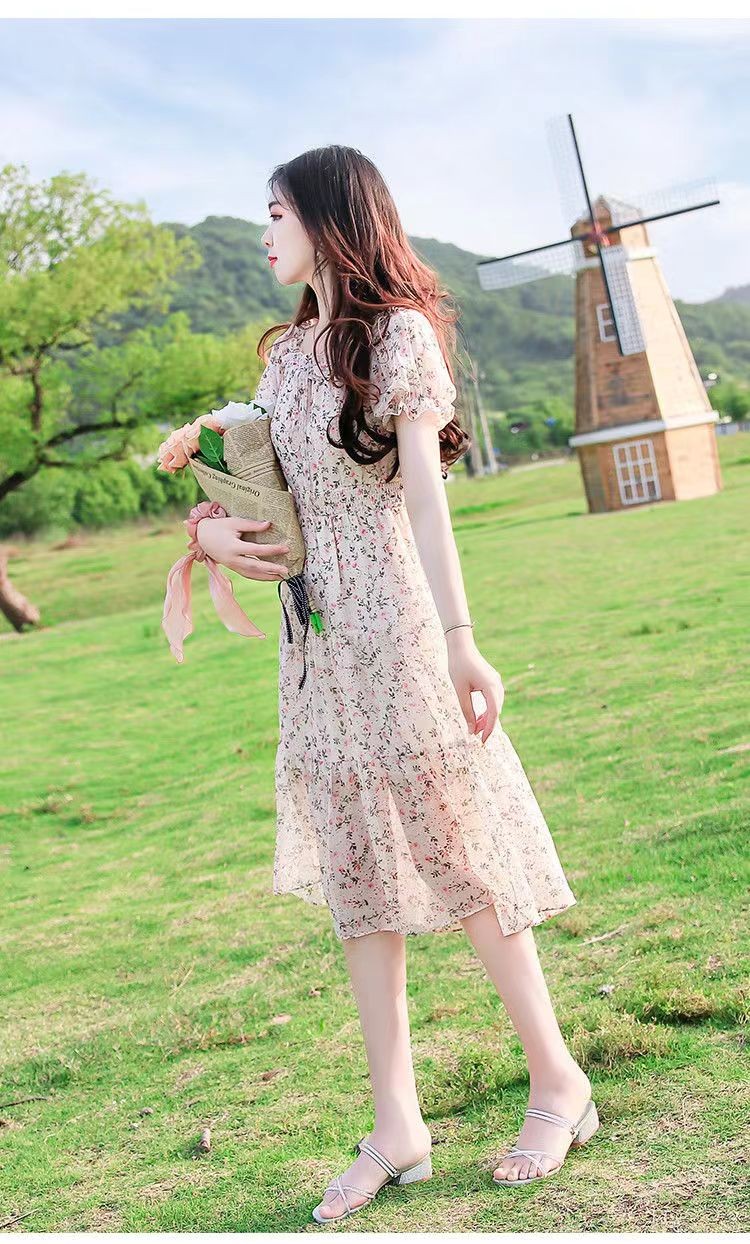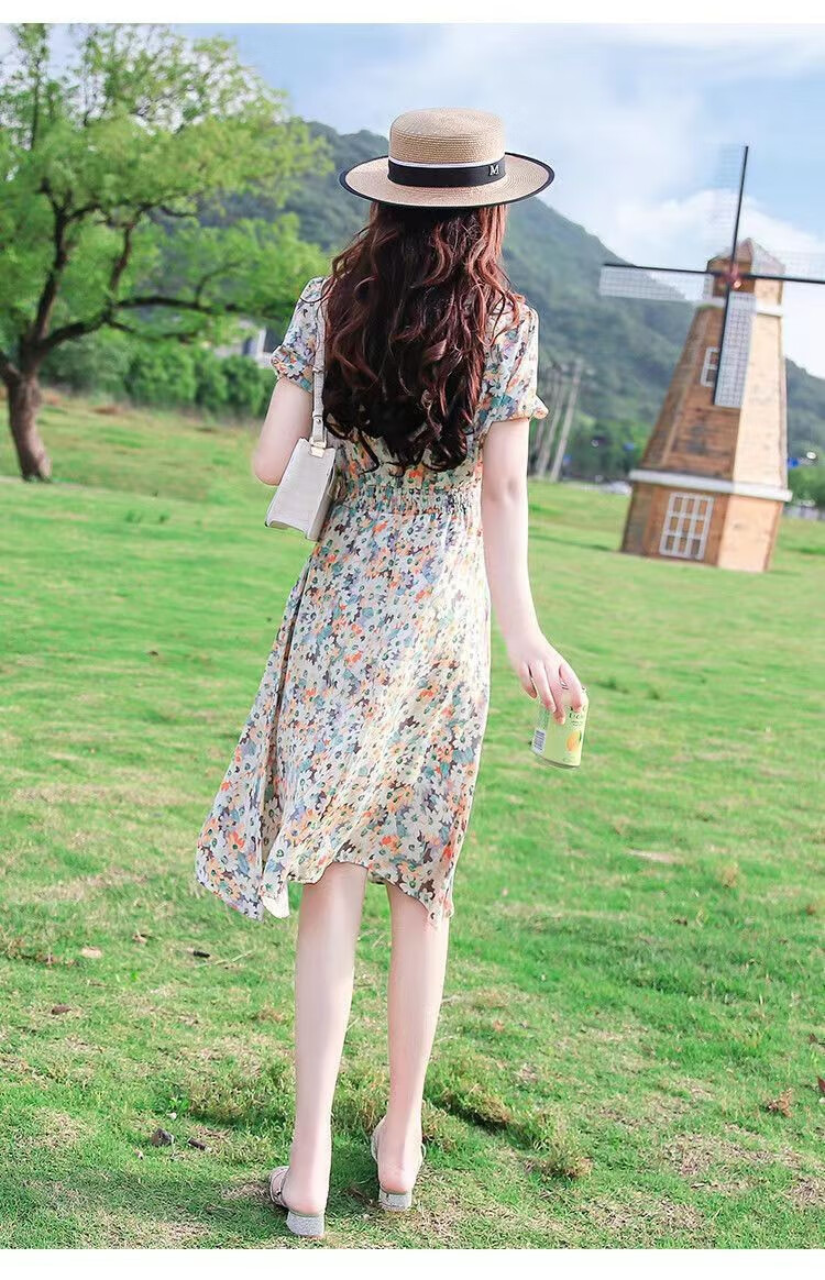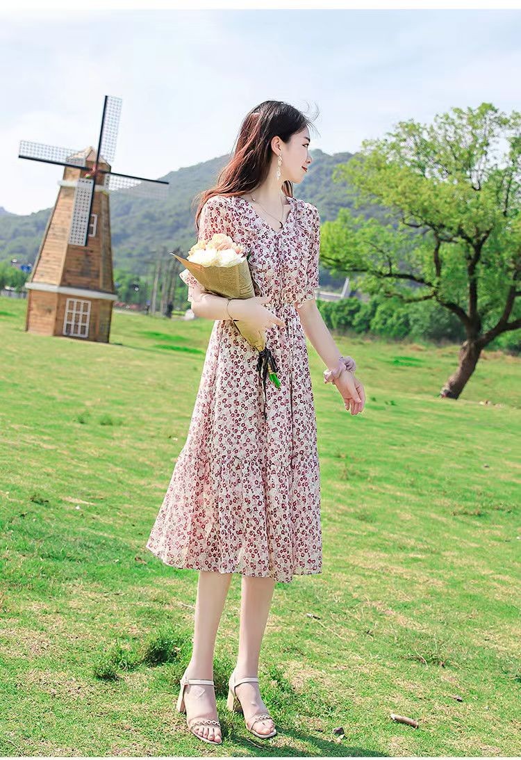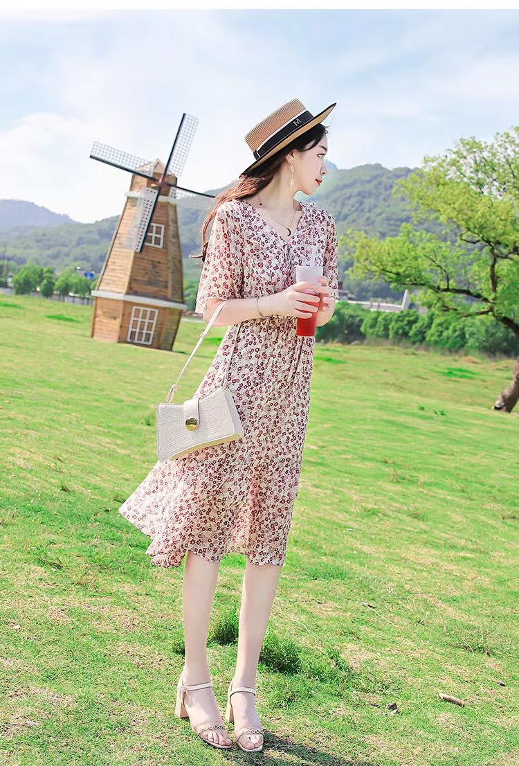 商品名称:凡龙 碎花雪纺连衣裙中长款2022新款夏季显瘦收腰减龄气质甜美小清新少女感小个子连衣裙 优雅款 M【建议95-105斤】