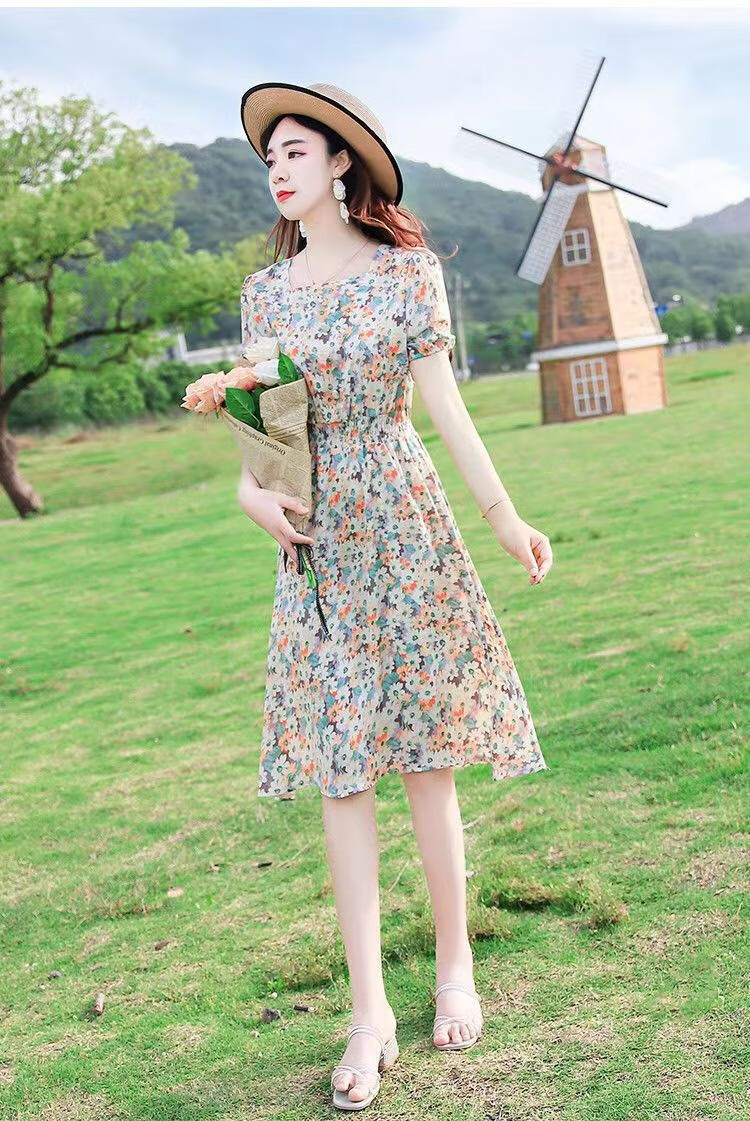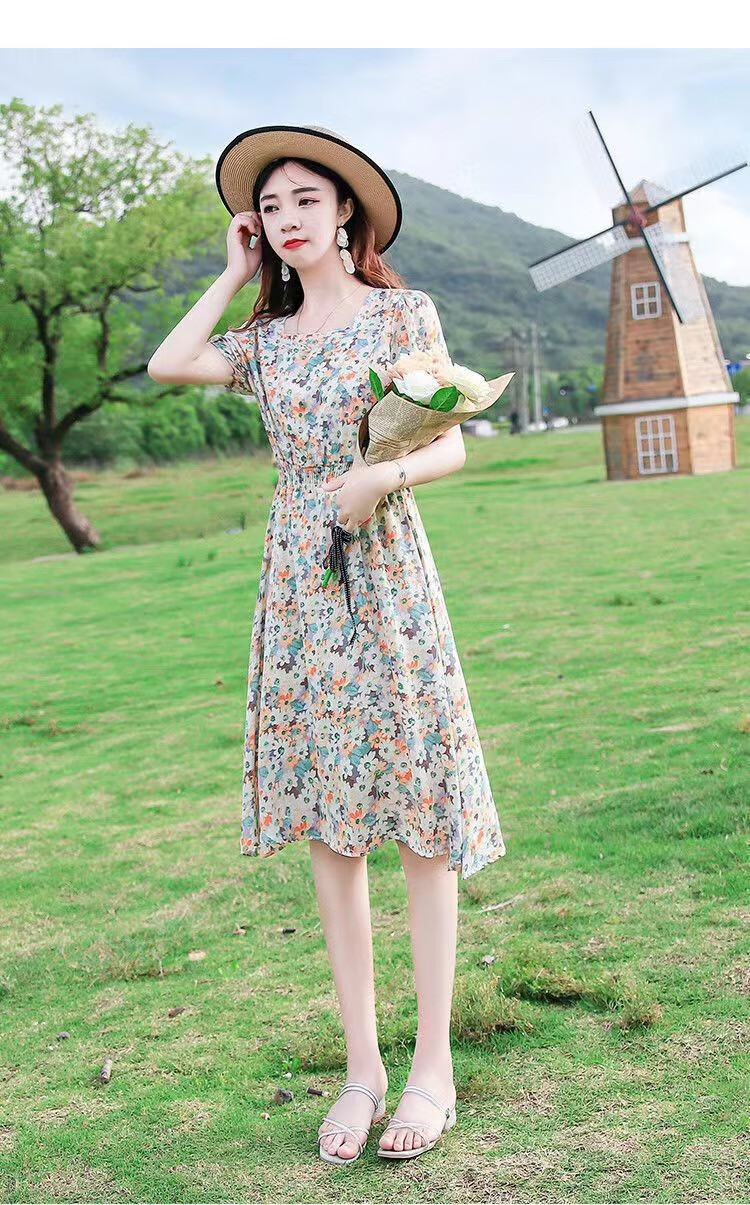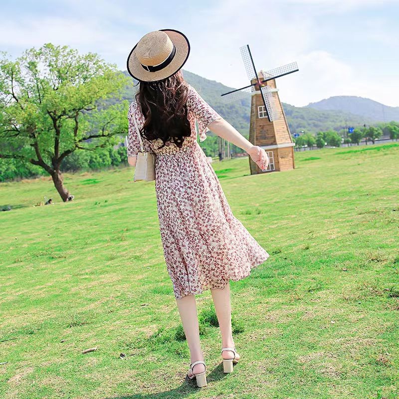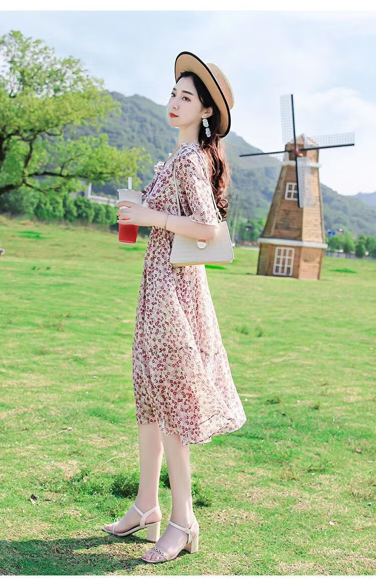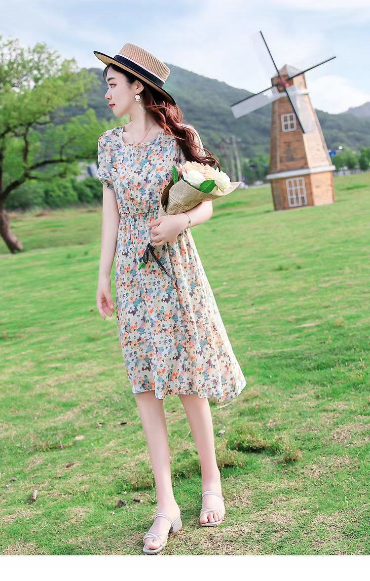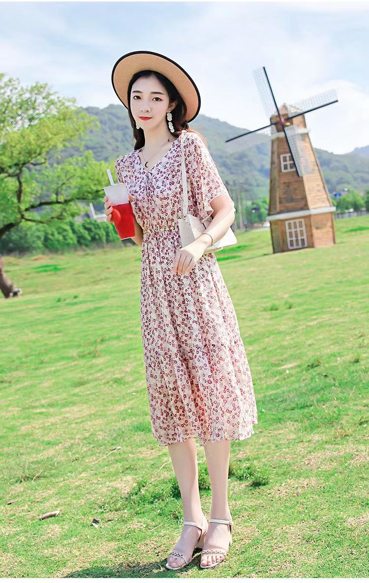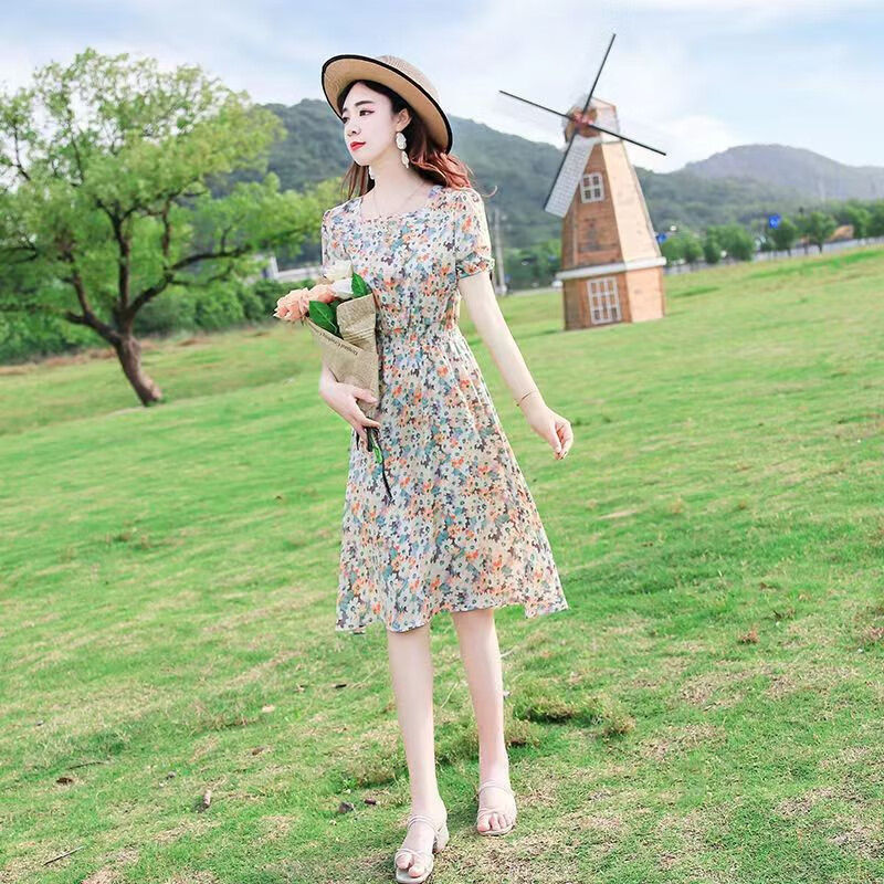 商品名称:凡龙 碎花雪纺连衣裙中长款2022新款夏季显瘦收腰减龄气质甜美小清新少女感小个子连衣裙 优雅款 M【建议95-105斤】