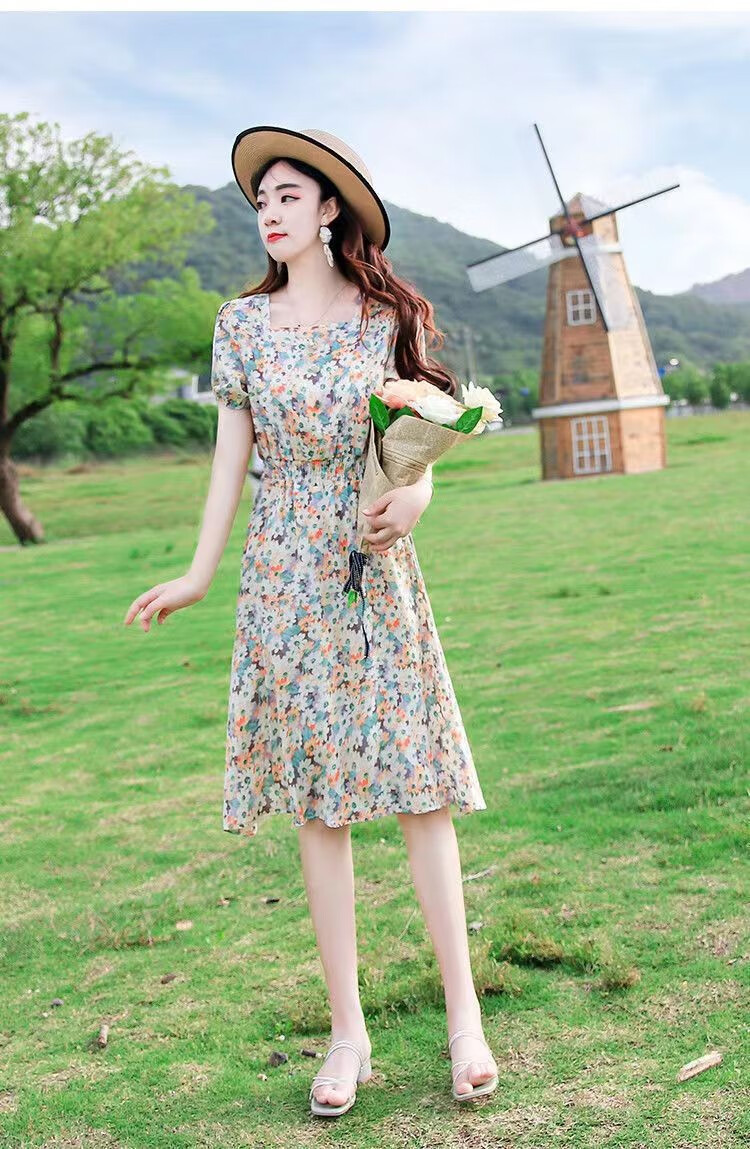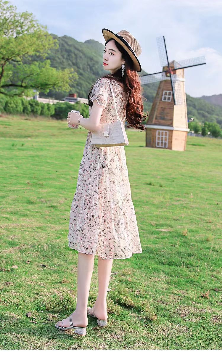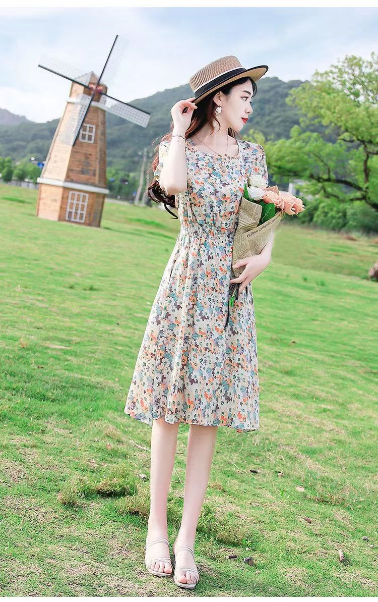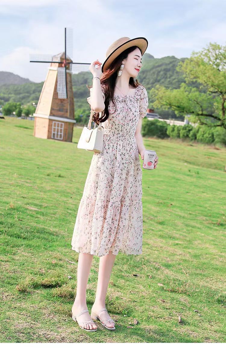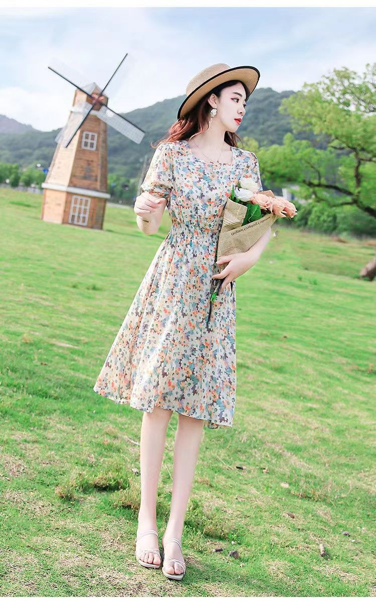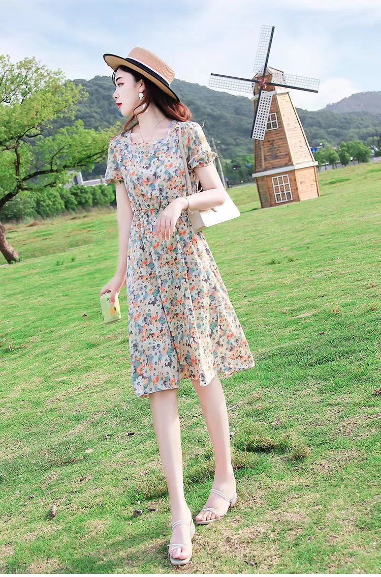 商品名称:凡龙 碎花雪纺连衣裙中长款2022新款夏季显瘦收腰减龄气质甜美小清新少女感小个子连衣裙 优雅款 M【建议95-105斤】