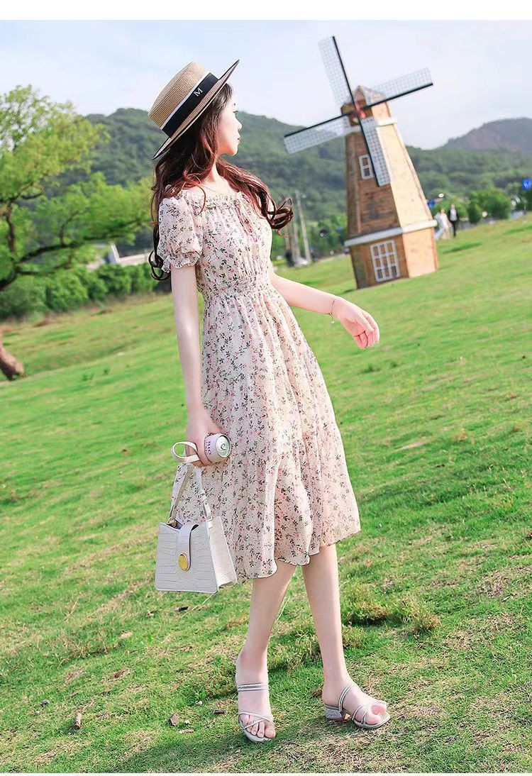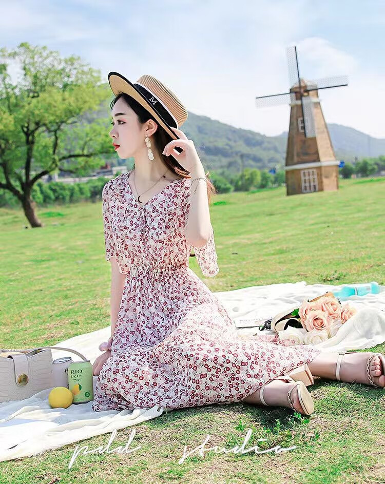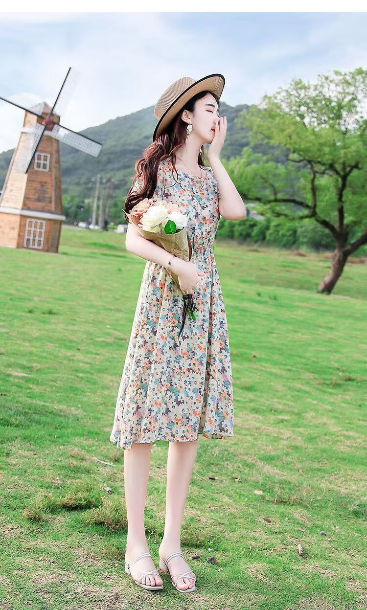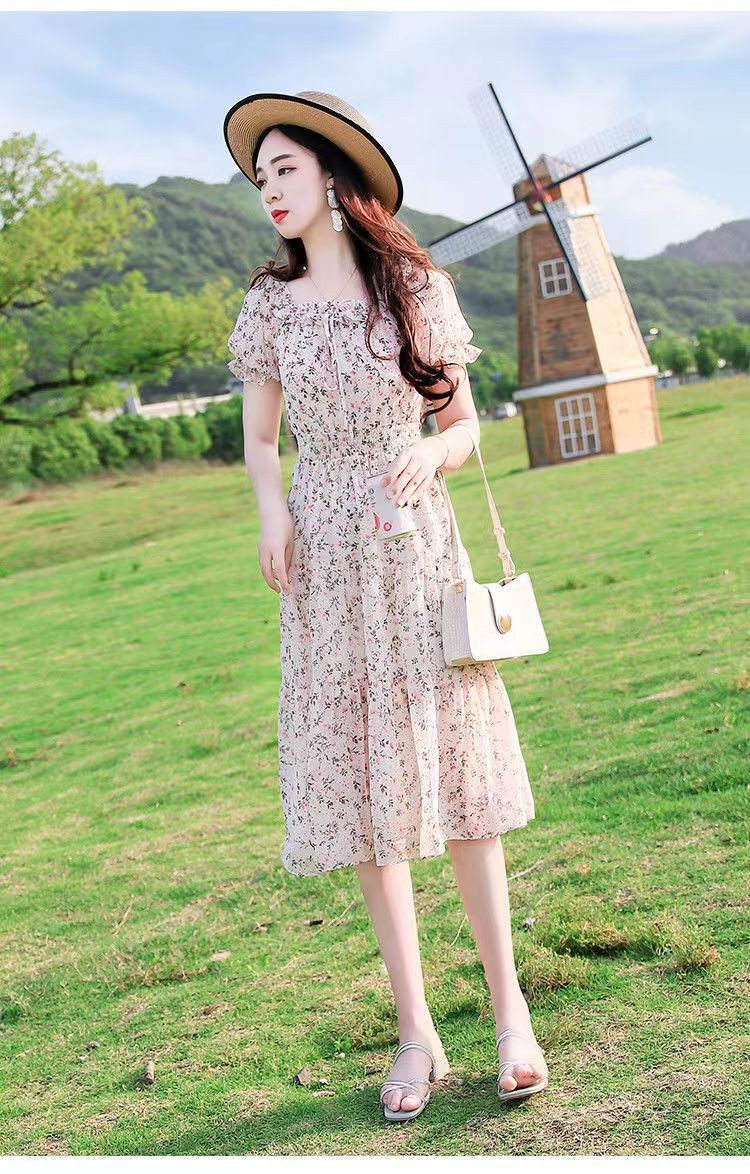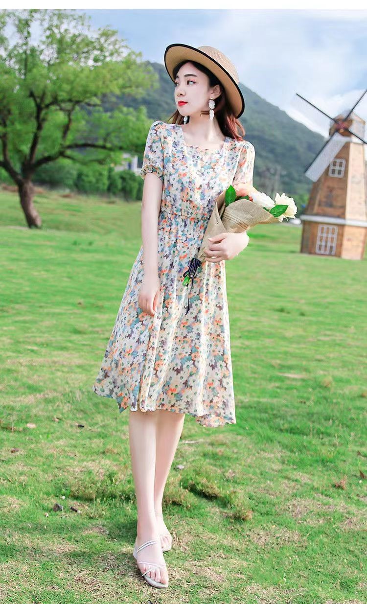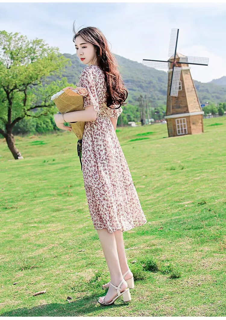 商品名称:凡龙 碎花雪纺连衣裙中长款2022新款夏季显瘦收腰减龄气质甜美小清新少女感小个子连衣裙 优雅款 M【建议95-105斤】