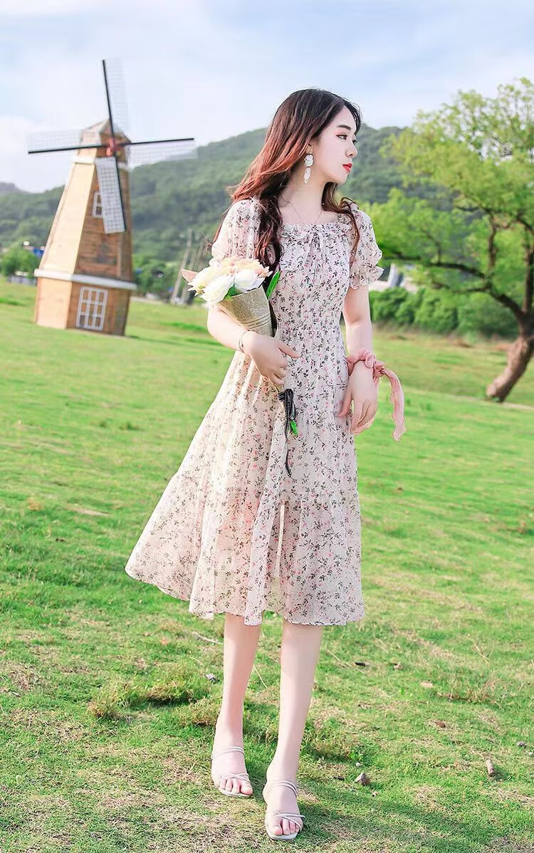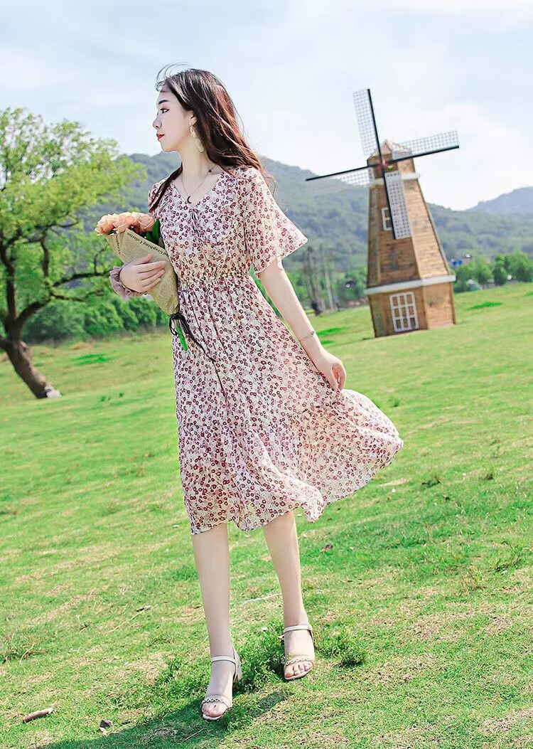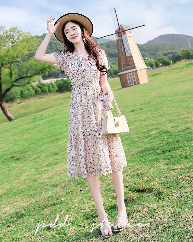 Fanlong floral chiffon dress, medium length, girlish, small stature dress, elegant style M [recommended 95-105 pounds]